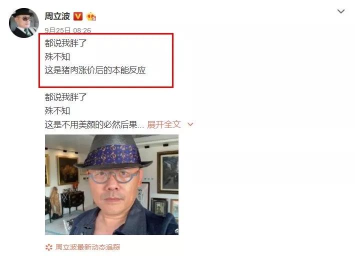 翻开周立波在微博记录的日常生活,大家能看出他一如既往地搞笑幽默,比如有人说他发胖了,周立波称这是猪肉涨价后的本能反应,以这种方式调侃自己,大概也只有周立波能做到。