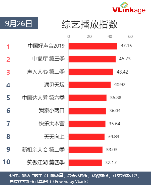 【综艺榜单】9月26日当日#综艺播放指数#:1.#中国好声音2019# 播放指数 47.15 2.#中餐厅 第三季# 3.#声入人心 第二季# 4.#遇见天坛# 5.#中国达人秀 第六季# 6.#我家小两口# 7.#快乐大本营# 8.#天天向上# 9.#新相亲大会 第二季# 10.#笑傲江湖 第四季#