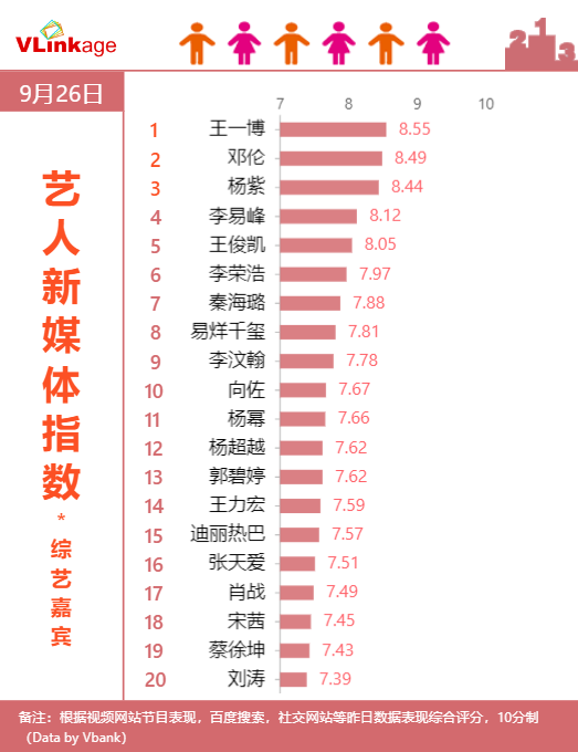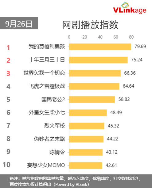 原标题:Vlinkage榜单 | 9月26日网播数据及艺人新媒体
