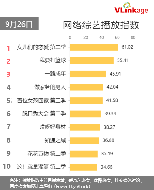 【网综榜单】9月26日当日#网络综艺播放指数#:1.#女儿们的恋爱 第二季# 播放指数 61.02 2.#我要打篮球# 3.#一路成年# 4.#做家务的男人# 5.#送一百位女孩回家 第三季# 6.#脱口秀大会 第二季# 7.#哎呀好身材# 8.#知遇之城# 9.#花花万物 第二季# 10.#这!就是灌篮 第二季#