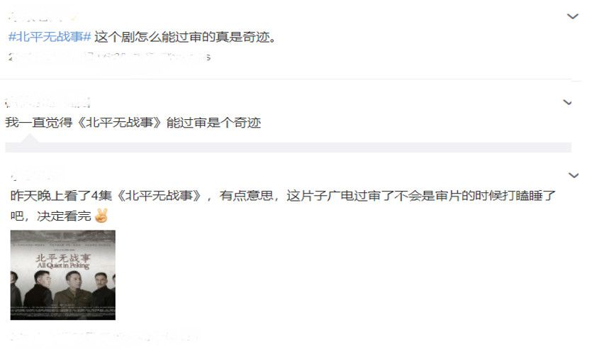 《北平无战事》在正剧里真的是非常良心的一部剧,每个角色鲜活生动,故事情节也不错。现在老戏骨扎堆,演技在线的剧真的不多了。小扒诚心推荐,如果大家国庆节剧荒了,可以重温一下这部电视剧呀,完美!