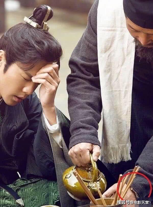 更有眼尖的网友发现范闲在北齐国都为调查言冰云被关押的下落,在其住处附近的一家路边茶摊假装投奔亲戚的外乡人打探消息的时候,倒茶的老板左手手腕上带了一个大金表,尽管有袖口遮掩却依旧被眼尖的网友发现了。还有一场肖恩被追杀的时候,屏幕右下角有彩色的反光,也被火眼金睛的观众看到了。