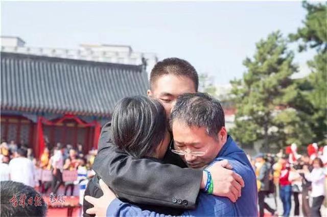 接下来,长春文庙为来自长春市第五中学等学校的18名青少年举办了“崇德向善 礼敬先师”成人礼仪式。身着现代中式服装的参礼者跟随礼仪官缓步走过泮桥,穿过棂星门和大成门,希望学有所成,发扬传统美德,从此踏上成才之路。在大成殿广场,参礼者恭敬肃立,向先师孔子像行三鞠躬礼,表达崇敬之意和有志于学的愿望;向家长敬献感恩茶,感谢他们的养育之恩。十八年精心的栽培与浇灌,十八年殷切的守护与期待,孩子与父母紧紧相拥,禁不住留下了激动的泪水,这一情景深深打动了许多现场的观礼者。整理心情,拭去泪水,家长向孩子赠送满载祝福的成年礼物后,又为他们佩戴了成人标志——黄帛(女生戴花环),象征正式成年。出席活动的领导和嘉宾还为参礼者颁发了成人证书,希望他们勤奋学习,弘扬美德,做有理想、有本领、有担当的好青年。最后,在场观众挥舞国旗,齐唱《我和我的祖国》,共同庆祝中华人民共和国成立70周年。