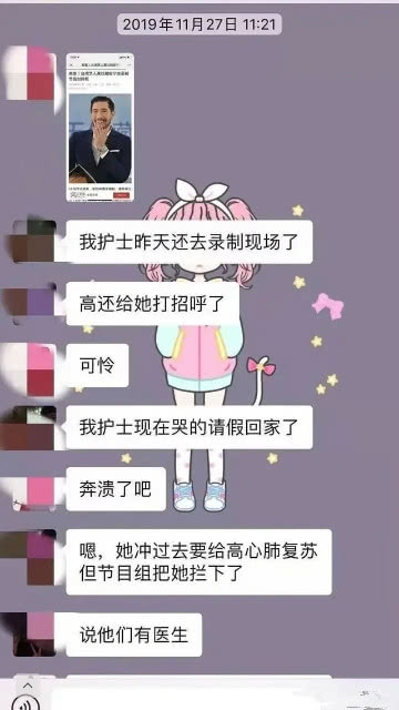 但是她看到高以翔晕倒以后,主动要去给高以翔做心肺复苏,结果被节目组的工作人员给拦下了。原因是节目组有自己的医生。当然至于节目组的做法究竟是否正确,还有待商榷,但是如果医护人员没有赶来,而又不让这位护士先行救治的话,那就太可恶了。