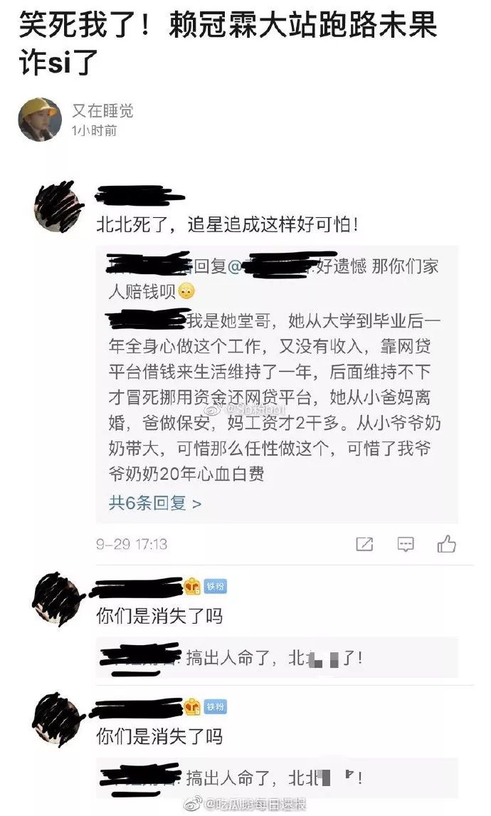 说实话,事情闹成这样真的挺遗憾的,我真的从来没有见过有人真的追星最后闹到自杀的,虽然这位北北干的事情真的是。。。不算值得同情吧,但人命就这么没了,还是觉得可惜
