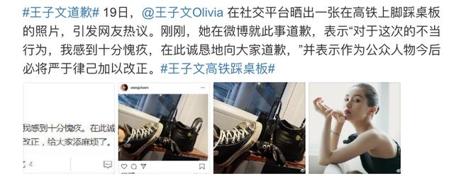 在此之前,王子文就被骂上了热搜,她也是坐高铁上晒脚,还穿着鞋把脚搁在了小桌子上,本来想炫耀名牌鞋的,结果翻车了,被网友骂这一行为太没有修养,最后王子文立马出面道歉。