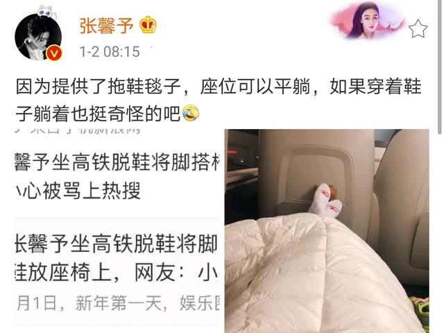 原标题:坐高铁脱鞋搭椅背被骂,张馨予删动态并解释是商务座,求生欲