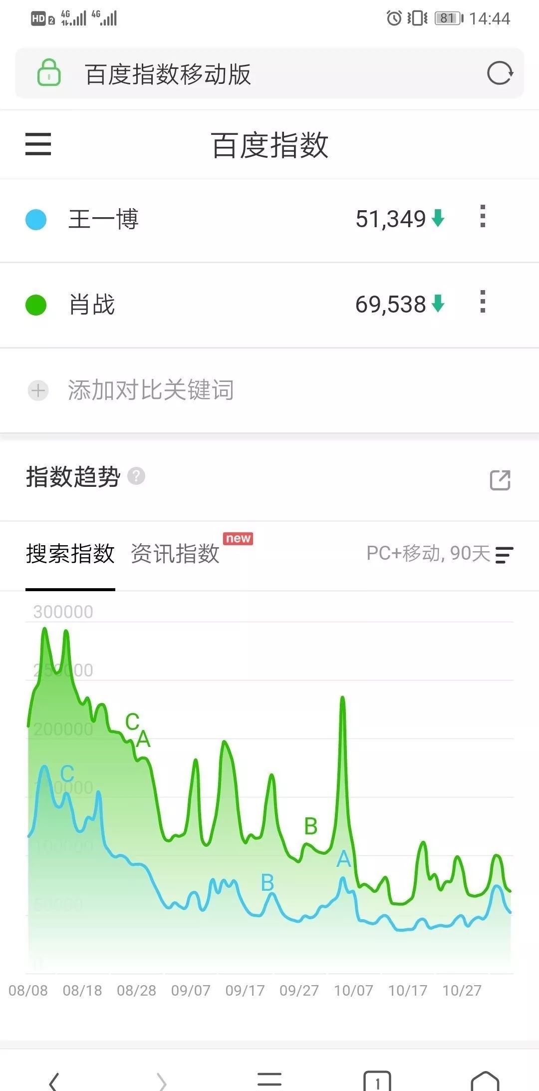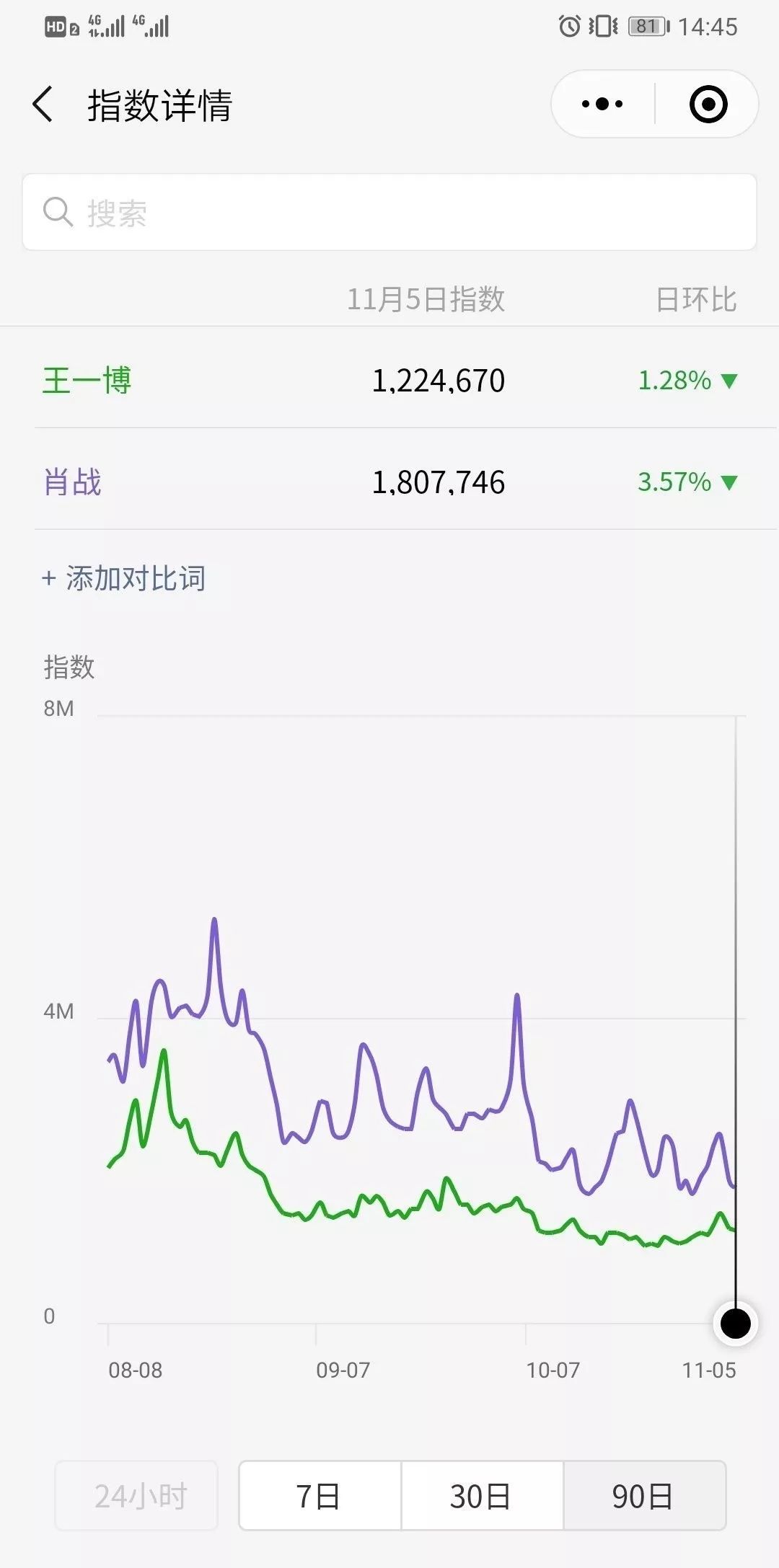 在对比肖战王一博两人90天之内的双指数趋势,肖战热度有所下降,王一博一直维持稳定……所以王一博这是超车肖战了?