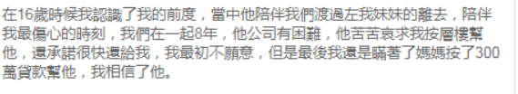 虽然二人最后分手,但分的四年来曹思诗也是对他各种帮助,她一直觉得陪伴了自己这么多年的一个男人不是坏人。直到前男友失联,债务找上门,曹思诗才意识到自己被骗得有多惨,并且发了声明,希望通过法律手段来维护自己正当权益。