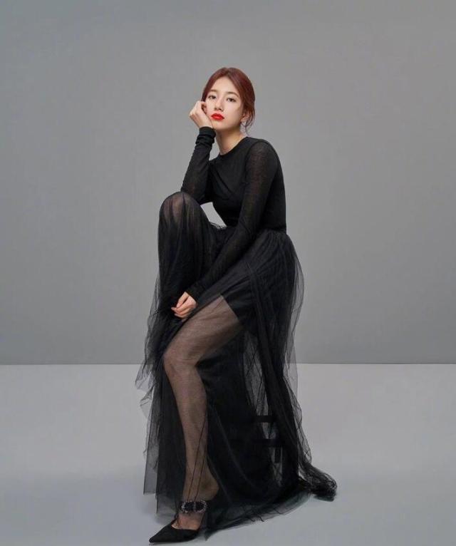 秀智的硬照功底一直都毋庸置疑的,穿上黑色蕾丝连衣裙,一双美腿若隐若现美得令人窒息,脚踩双黑色尖头高跟鞋,显得身材比例更好了。