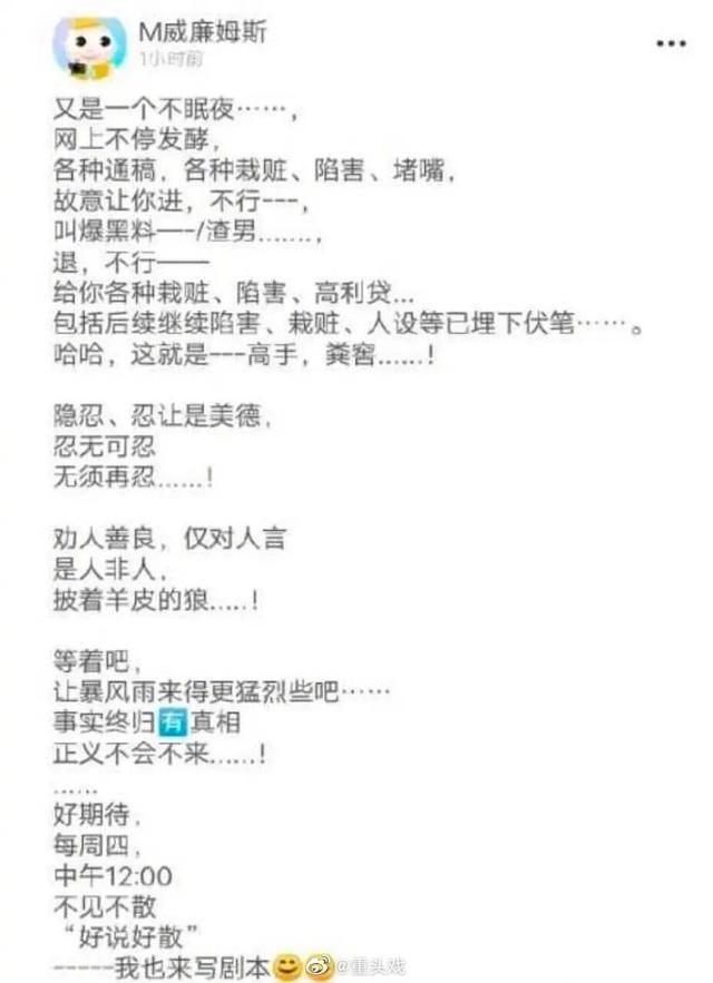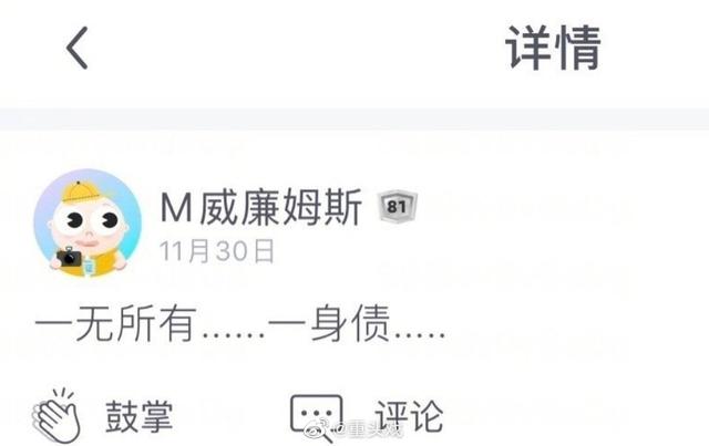 还说自己一无所有,一身债。另外还预告了一把,今天中午12点不见不散,看样子要回踩郑爽。