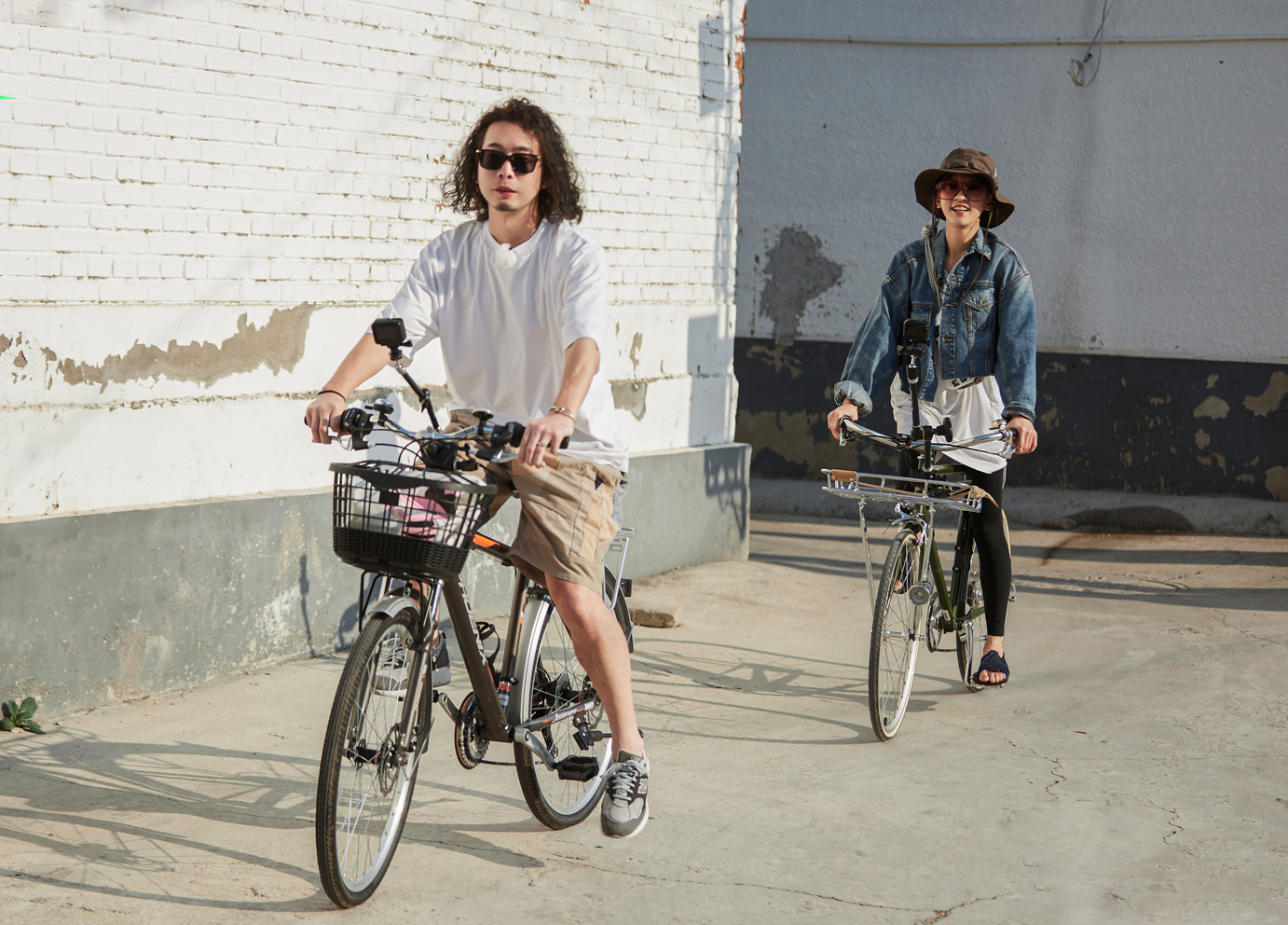 一起骑单车外出,许富翔白t短裤来得干脆利落,后面的陈意涵牛仔外套配紧身打底裤,虽然和老公穿成了两个季节,然而外面露出的长长的衣摆,还是很有呼应对方上衣的意思,同样带着墨镜,泡面头和宽檐帽隔空配合有趣极了。