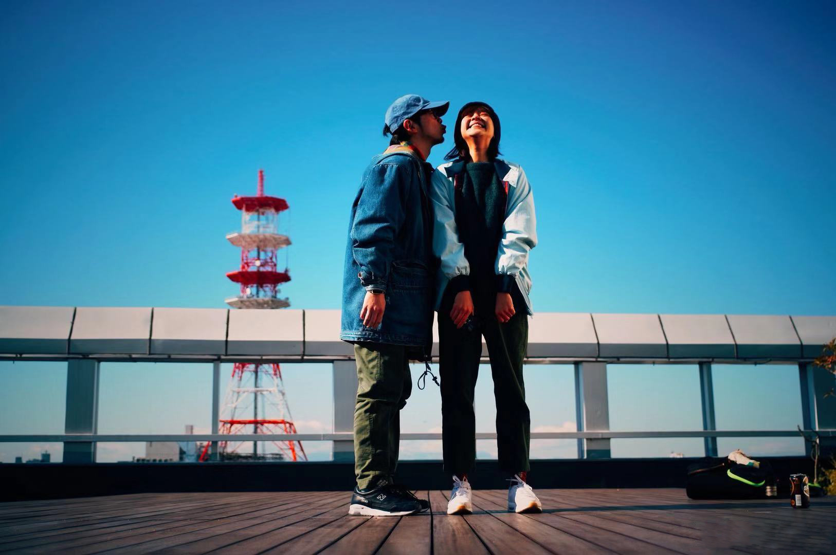 宽松的牛仔外套搭配休闲的下装,同时穿成五五身的两个人走在一起,画面显得自然又轻松,黑白配的运动鞋让夫妻造型更加完整。
