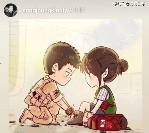 这到底是什么情况呢?虽然宋仲基发出来的只是卡通图片,但其实大家都知道,这是属于他在《太阳的后裔》里面,为了宋慧乔系鞋带的照片,也是这一对CP组合照片,让大家爱上了双宋。