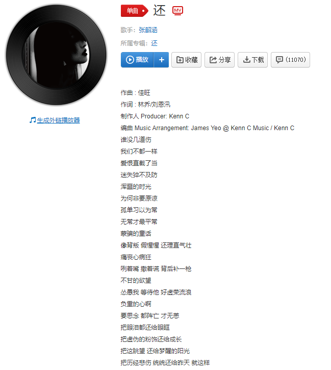 9月20日,张韶涵发布新歌《还》/截图自网易云音乐官网