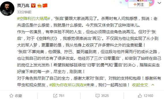 贾乃亮在和李小璐被曝离婚后,则是全心投身到了新戏中。其新戏《空降利刃》刚刚播完,贾乃亮还专门发文告别,表示了自己的不舍。从其言语中,仿佛是写自己,称自己重新归零,重新开始。