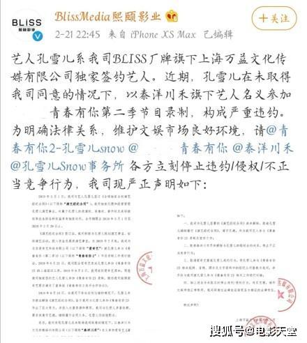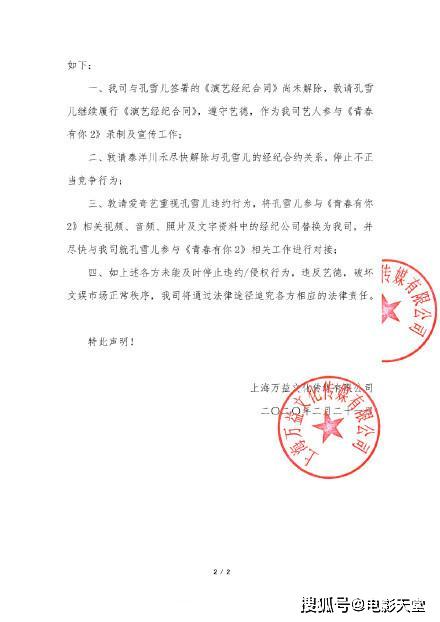 现在万益文化要求孔雪儿、节目制作方、泰洋川禾、孔雪儿snow事务所四方立刻停止违约/侵权/不正当竞争行为。这这份长达一页半的声明中,可以看出来孔雪儿早在2019年3月与原经纪公司签订了《演手机电影网艺经纪合同》,并且合同指明结束时间为2024年2月底。
