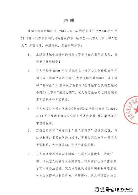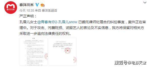目前从万益文化的声明中可以看出来,他们的诉求也是很公正合理的,毕竟孔雪儿作为自己公司的艺人,出了这种事情,谁都忍不了。今日上午,泰洋川禾也发表声明表示孔雪儿女士已委托律师处理合约纠纷事宜,案件正在审理中。