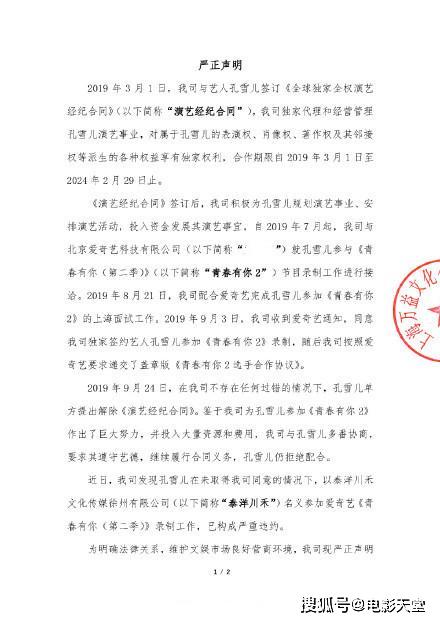 在这份声明中可以看出,孔雪儿原先所在的公司上海万益文化传媒有限公司,在辛辛苦苦为孔雪儿筹备了一系列的节目准备工作以后,却换来了孔雪儿单方面的意图解约。协商无果后,在还没有解约的同时,便以泰洋川禾旗下艺人的名义参加节目录制,构成严重违约行为。
