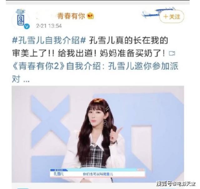 原来在刚发完选手自我介绍的时候,《春春有你2》官媒发表了一条关于对孔雪儿的评论,内容是:"孔雪儿真的长在我的审美上了!给我出道!妈妈准备买奶了!"无数网友看了之后纷纷感到不可思议。