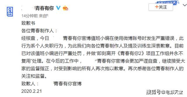 虽然最后这件事情不了了之了,但是接下来发生了更多离奇的事情,让人匪夷所思。2月21日《春春有你2》官媒分享了各位训练生的自我介绍,这是提前为节目作预热铺垫,但是没一会,《春春有你2》官媒删除了关于孔雪儿的一段评论,并发表了一条道歉声明:账号发生错误,系个人失职行为。