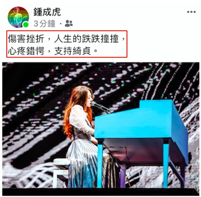 陈绮贞被迫沦为小三后,与她相恋了18年的旧爱钟成虎得知此事后发文,表示:“伤害挫折,人生的跌跌撞撞,心疼错愕,支持绮贞。”