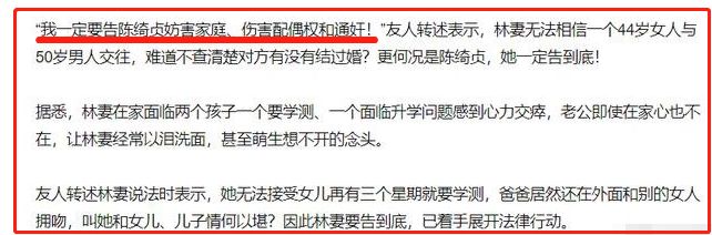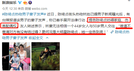 12月26日,与陈绮贞热吻的林先生妻子得知此事后,首次发声,称已经着手展开法律行动,提告陈绮贞妨碍家庭和伤害配偶权两个罪名。还对陈绮贞方的发声提出质疑,林妻表示无法相信陈绮贞作为一个大明星会不知道对方是否已婚,她一定会告到底!