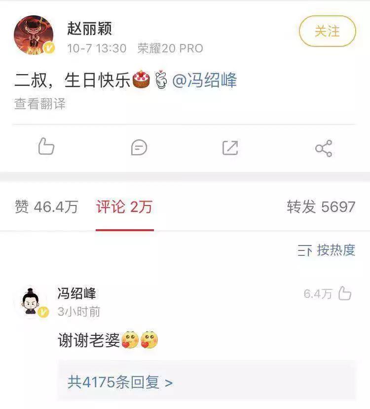 先有#赵丽颖叫冯绍峰二叔#公开为冯绍峰庆生。