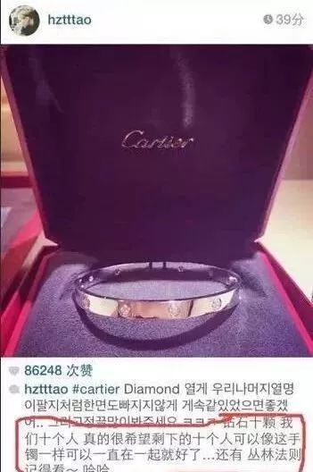 就在最后吴亦凡退团已经实锤的时候,涛涛还是忍不住又一次发声,还贴上了一张镶有十颗钻石的手镯并且配文,“剩下的是个人像钻石一样”。