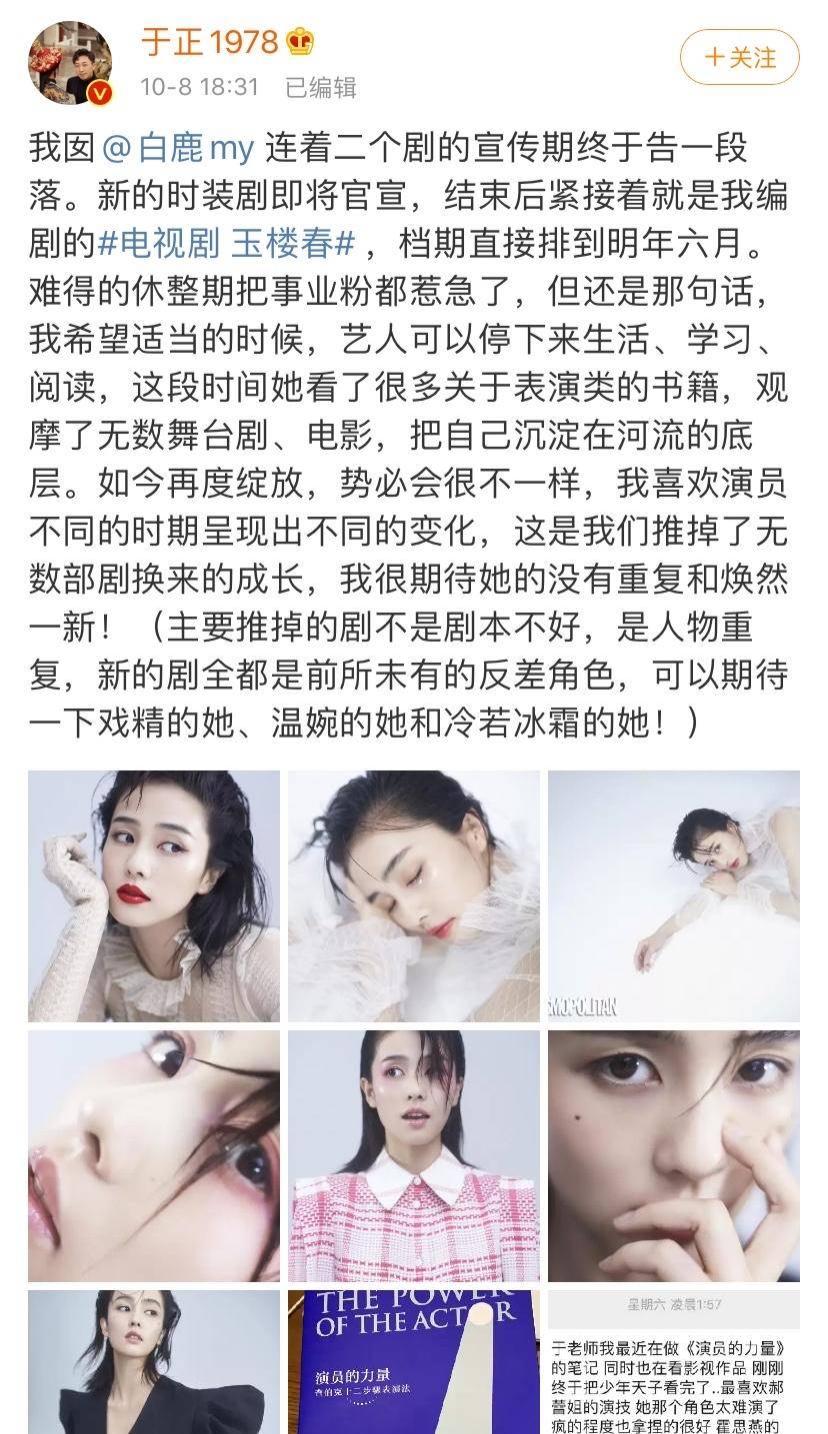 于正为了捧红白鹿,可以说真的是费了不少心血啊,还特地写了个剧本给她。在电视剧《玉楼春》中,白鹿又双叒叕是女主角,档期直接排到明年六月,真的是用心良苦的栽培了!