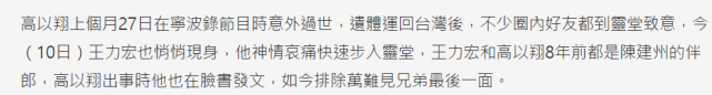 陈建州夫妇与高以翔有很深厚的友谊,8年前,他们结婚时还请了高以翔当伴郎,见证他们的幸福。当时的伴郎团还有王力宏、彭于晏,被称为史上最帅伴郎团。