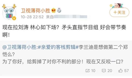 结果就气得芒果台宣传部的高层小胜站出来,说节目组明明已经为了她好,把对她不利的部分剪掉了,现在又反咬一口。还说李兰迪拉林心如、刘涛下场什么的,问李兰迪是不是想做第二个郑凯吗?