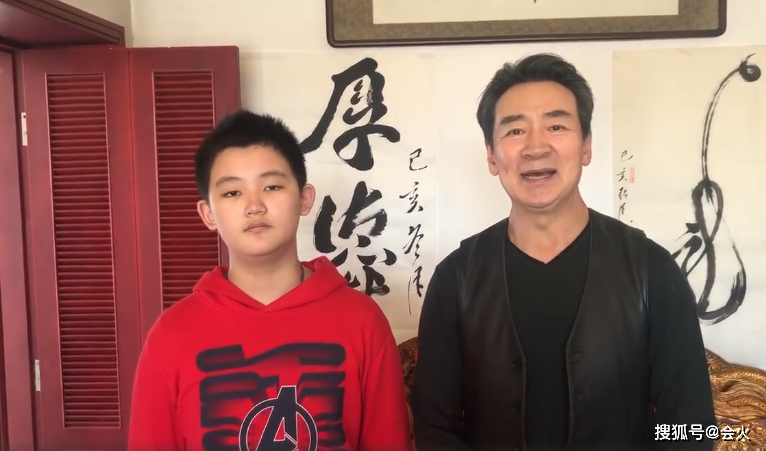 寇家宝穿着一件红色卫衣,脸上肉肉的,十分可爱。寇家宝眉眼之间与寇振海也非常相似,才12岁的他身高已经直逼老爸。