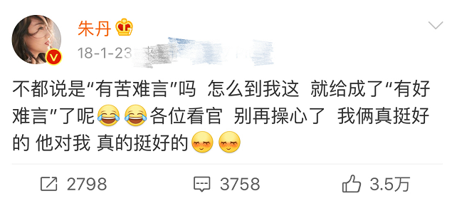 尽管,朱丹先后多次在微博上表示:“他对我真的挺好的”,还是无法让广大网友消除心中疑虑。实际上,感情这个事情真的是如人饮水,冷暖自知。一个人过得幸福与否,从她平时的状态中是完全看得出来的!每当提到周一围,朱丹就像一个迷妹一般,满脸洋溢着幸福的笑容!