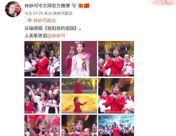 9月29日。林妙可中文网官方微博晒出了林妙可压轴领唱《我和我的祖国》的照片。照片中,林妙可身穿一身红裙,站在一群学生中间,演唱地非常投入。