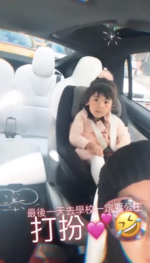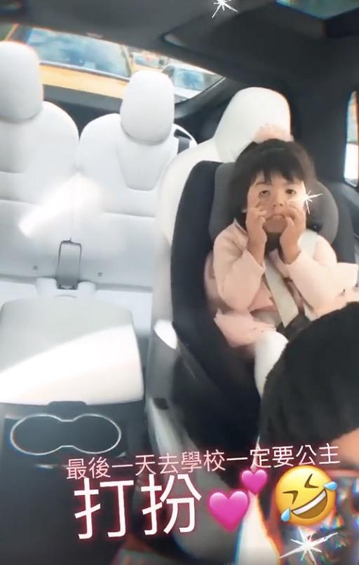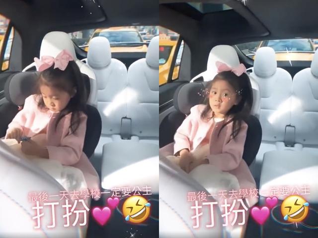 随后镜头慢慢转向车座位的另外一边,咘咘也穿着粉色的风衣,扎着大蝴蝶结,散发公主气质。