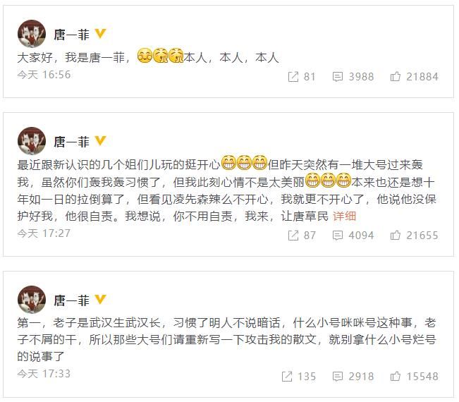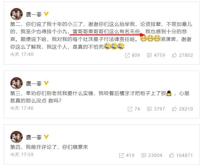 12月19日,唐一菲重新回归微博,并且连发了五条微博,不仅再次谈及遭遇网络暴力的痛苦,更怒斥外界关于她是“小三”的传闻:“谢谢你们这么抬举我”“我对我的每个吐沫星子付法律责任”,顺便还内涵了姚晨和她的绯闻对象“雷哥哥”“果哥哥”。