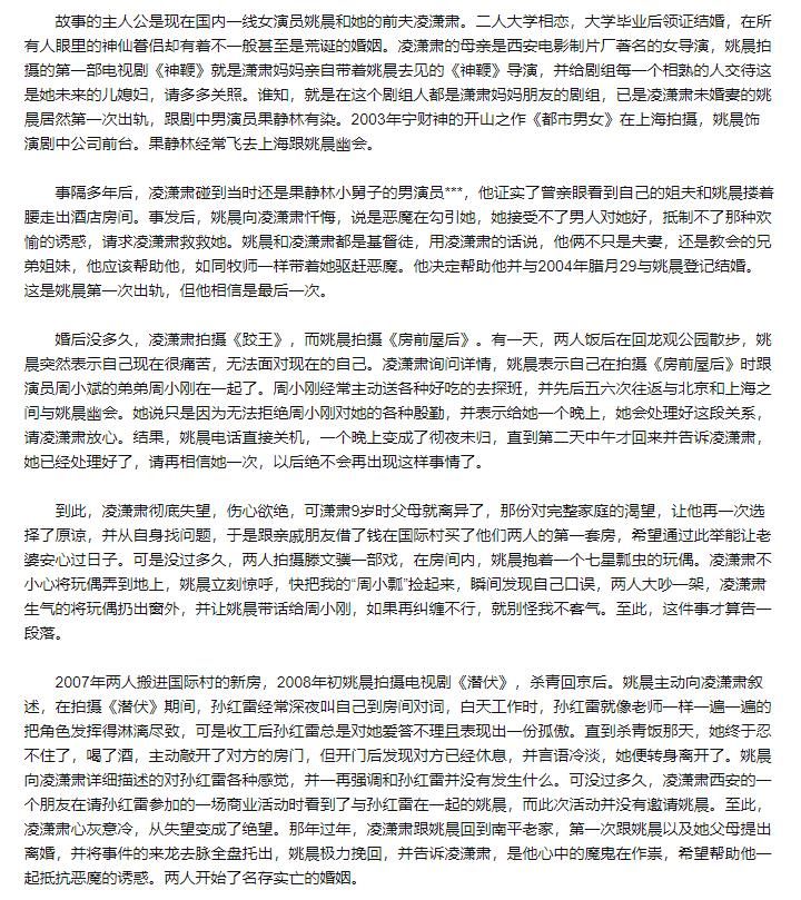 熟悉八卦的朋友人应该都知道,2014年凌潇肃和姚晨的离婚事件反转,圈内人巨春雷发长文披露他们离婚的真相,称姚晨婚前婚后多次出轨,导致凌潇肃忍无可忍才提出离婚,同时他还在文中还指点道姓的曝光了姚晨的出轨对象—孙红雷,果静林,周小刚,甚至称曹郁也是姚晨的出轨对象。
