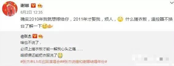 事后张杰发微博道歉,说要罚自己跪洗衣板和洗衣服,而谢娜则马上出来维护老公,说自己确实在2010年就想嫁给张杰,不过张杰2011年才娶了她。什么都不说了,只能羡慕张杰娶了一个这么好的老婆。