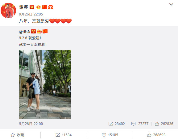 “爱秀恩爱”一直是谢娜的标签之一,而昨天谢娜终于可以名正言顺地秀恩爱啦,9月26日是谢娜和张杰的8周年纪念日,两夫妻在当天晚上齐齐发微博庆祝,“杰就是爱”非常甜蜜。