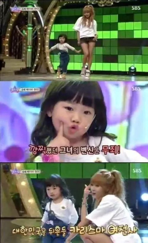 当天小夏恩表演了泫雅的HIT曲《bubble pop》和《change》,不管是舞蹈动作还是表情管理都相当到位。跟泫雅本人一起跳舞时,简直就是Ctrl+C然后再Ctrl+V,明星范儿十足。
