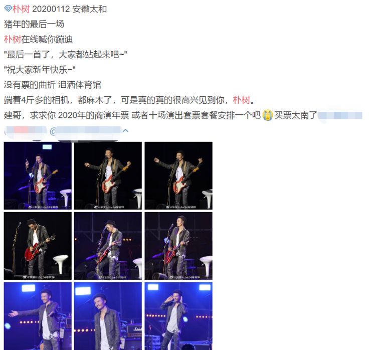 就在1月12日晚,朴树现身安徽省太和县体育馆进行商演,并在现场演唱了十首歌曲。这场活动并不是专门为朴树举办的演唱会,而是某开发商举办的商业活动,目的是宣传新盖的楼盘,时不时会有主持人站出来打广告宣传房子。不过因为活动有朴树,不仅门票全部卖光,很多人甚至还因为没抢到票而懊恼。