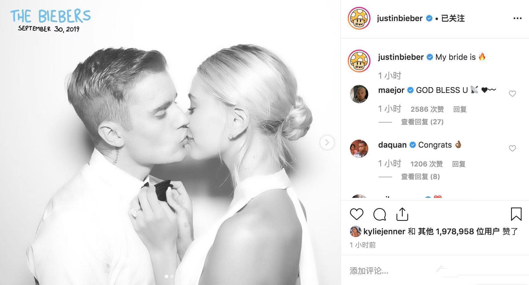 原标题:比伯海莉结婚,多名歌星好友参加婚礼,比伯晒夫妻俩恩爱