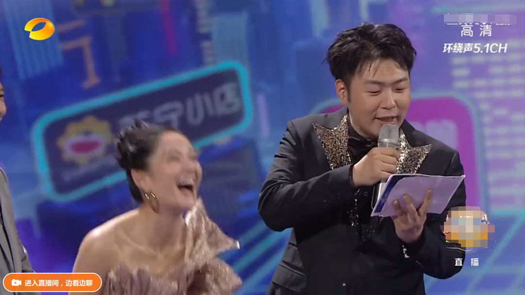 在跟自家兄弟海涛对词时像一辆没刹车的快车,只顾自己“哈哈”大笑,总是以此种简单粗暴的方式带动气氛,甚至中间还一度笑到蹲地!这种状况作为一位专业的主持人是不被允许的。