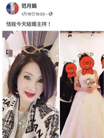 故而在普通人眼里既然恬娃与费玉清关系不错,想必本人也是一位德高望重的资深艺人,谁知居然做出这样厚脸皮的事情来。原来1月19日是台湾一对新人的结婚之日,来了不少亲戚朋友,大家欢聚一堂。有网友发现恬娃也在婚礼现场,并且她表现得十分异常,一直在找各种角度拍新人,还在收礼区跟新人婚宴背板合照,甚至走进了婚宴会场拍下工作人员还在布置准备的画面,照理说为了维持婚礼现场的秩序是不允许这样拍照的,不过大家都以为恬娃是新人的亲戚太过高兴才会如此,也就没有阻止。没想到恬娃回去后居然不经过新人同意便将新人照片公布到网上,并且睁眼说瞎话:“恬娃今天结婚主持。"