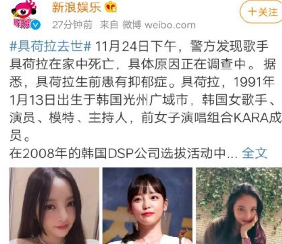在这之后,具荷拉也曾多次在社交平台袒露内心的痛苦,“一句话能杀人,也能救人”,“再见”等等动态,都让不少人对具荷拉的人身安全表示担心。