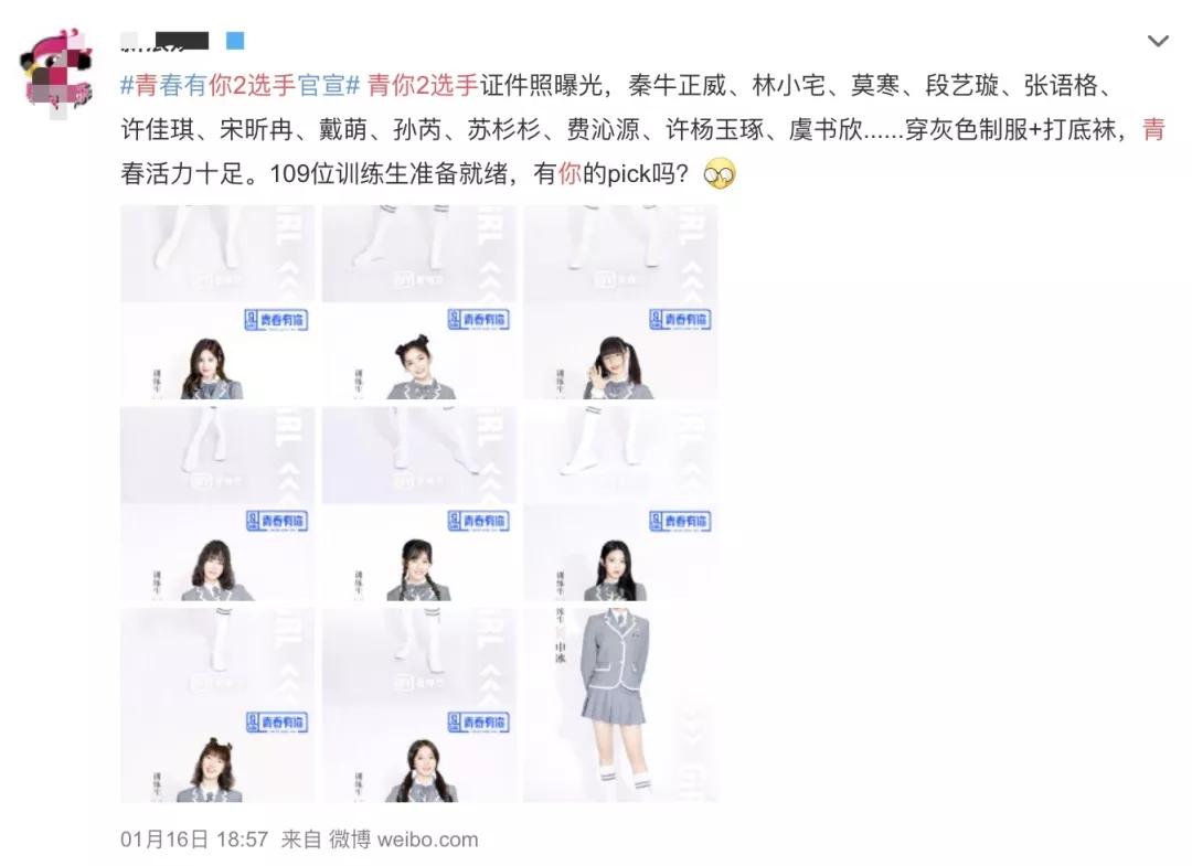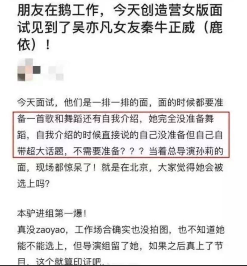 自从节目官宣阵容之后,练习生们陆陆续续的上下班照片也传了出来,粉丝超话打榜、站子日常营业,热度、话题最大的很明显,就是吴亦凡之前的绯闻女友:秦牛正威,微博ID鹿依。