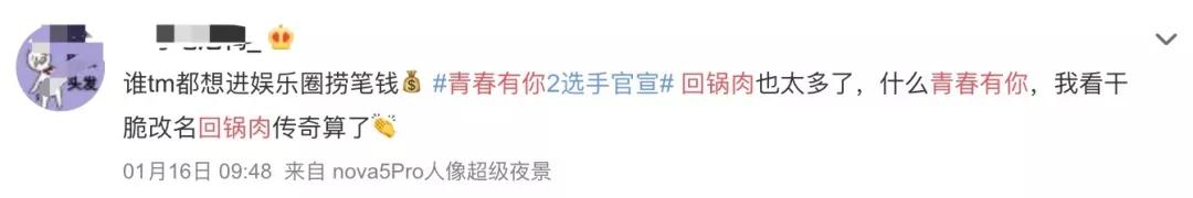虽然现在很多节目打着选秀的幌子搞娱乐圈再就业,可这也太明目张胆惹,一个、两个可以理解,十个、二十个绝非偶然吧?网友建议:不如改名回锅肉传奇。