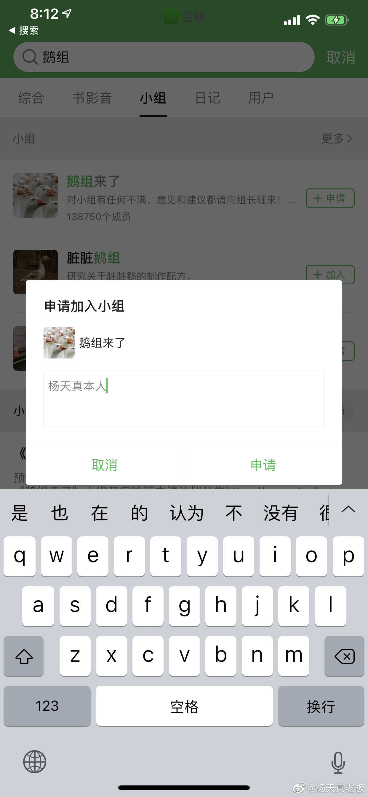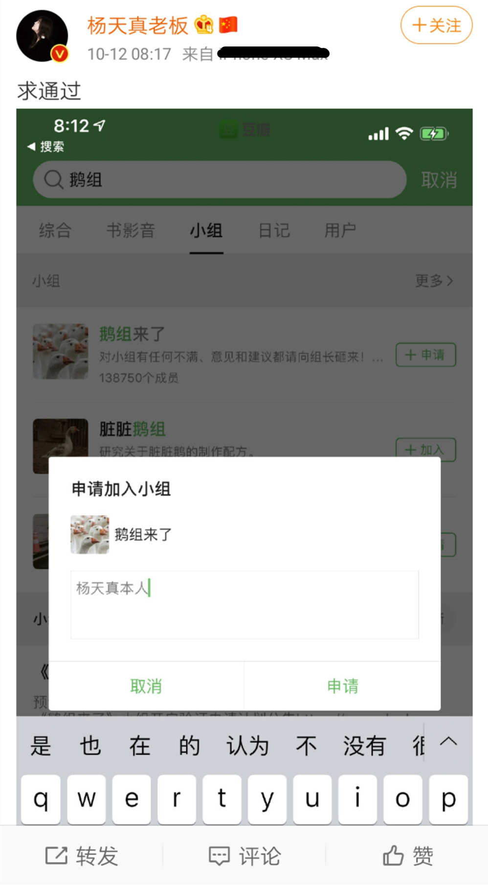 而更加搞笑的是,她进的这个组并不是真正的鹅组,鹅组全名豆瓣鹅组也就是大名鼎鼎的八组,是许多八卦的发源地,最近最有名的一件事应该就是有一名豆瓣鹅组的成员在北京偶遇了魏大勋和一名女子,结果被八组成员扒出是杨幂,这件事情从鹅组发酵到之后上微博头条可以说鹅组真的是娱乐吃瓜第一线哈!