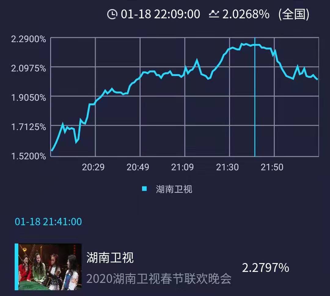 1月18日,腊月二十四,南方小年,湖南卫视播出2020春节联欢晚会。当晚,只有湖南台一家播出春节晚会节目,所以轻松实现了一枝独秀的局面。尤其是直播进行,彰显了湖南台在晚会举办方面别具一格的优势。收视率夺冠,已经是情理之中的事情。观众更为关心的,则是湖南台到底能够取得多么优秀的收视成绩。